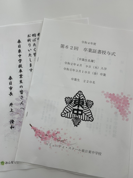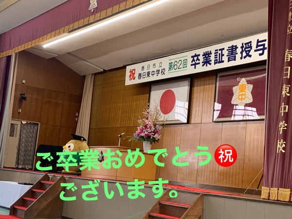 令和5年3月10日、春日東中学校の卒業式に、来賓として参加させていただきました。今年の三年生は、これまで続いてきたコロナ禍で、3年前の入学式も中止となり、様々な学校行事や修学旅行も予定通りに行われなかった学年ですが、「凛」とした卒業式でした。感動しました。卒業生、そして保護者の皆さまおめでとう㊗️ございました。